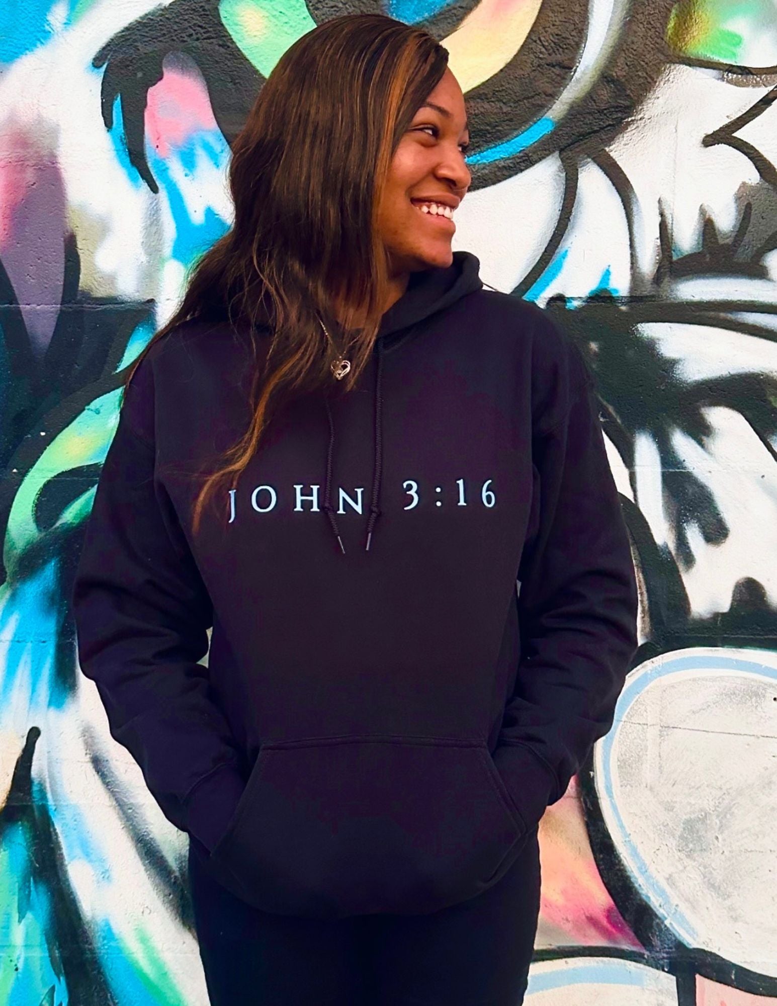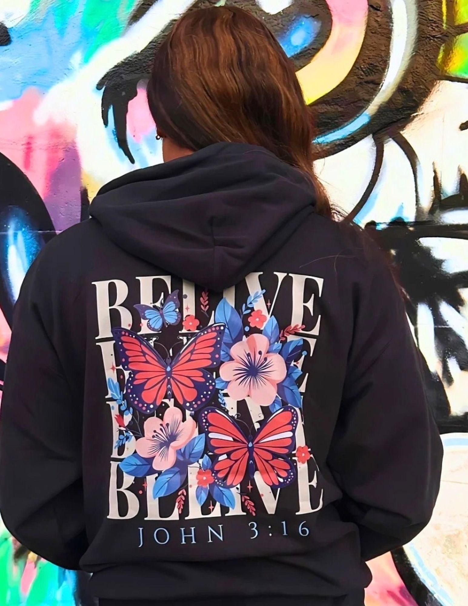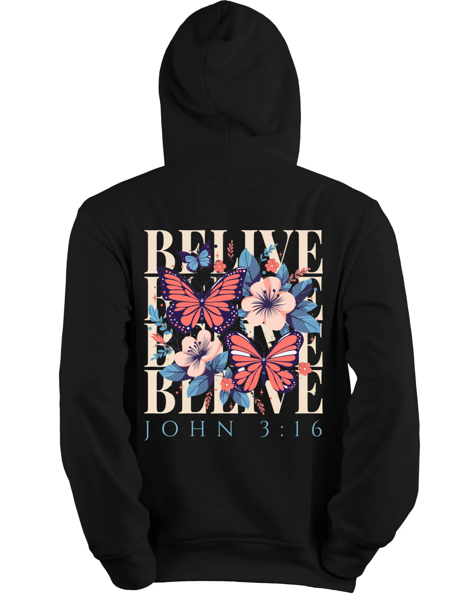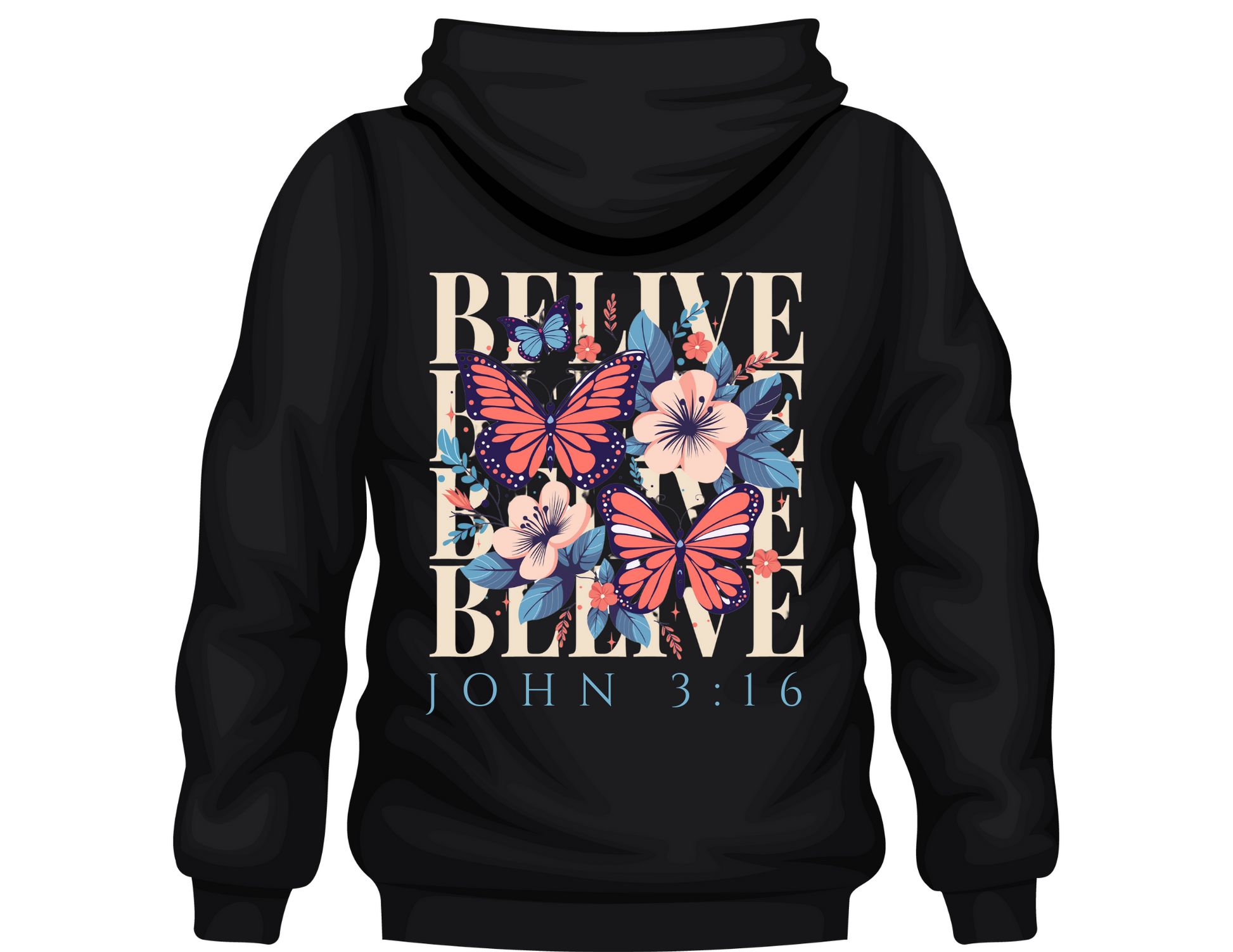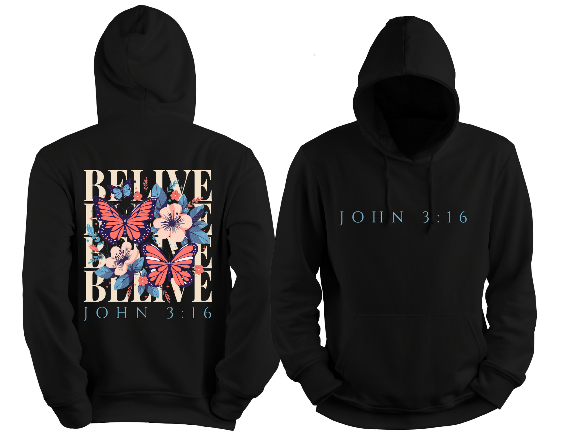 The front of the hoodie features the powerful scripture "John 3:16" in elegant, understated text, serving as a daily reminder of the strength and love found in faith. On the back, the message "Believe" is brought to life with a stunning design of vibrant butterflies and delicate flowers, symbolizing transformation, hope, and renewal.
