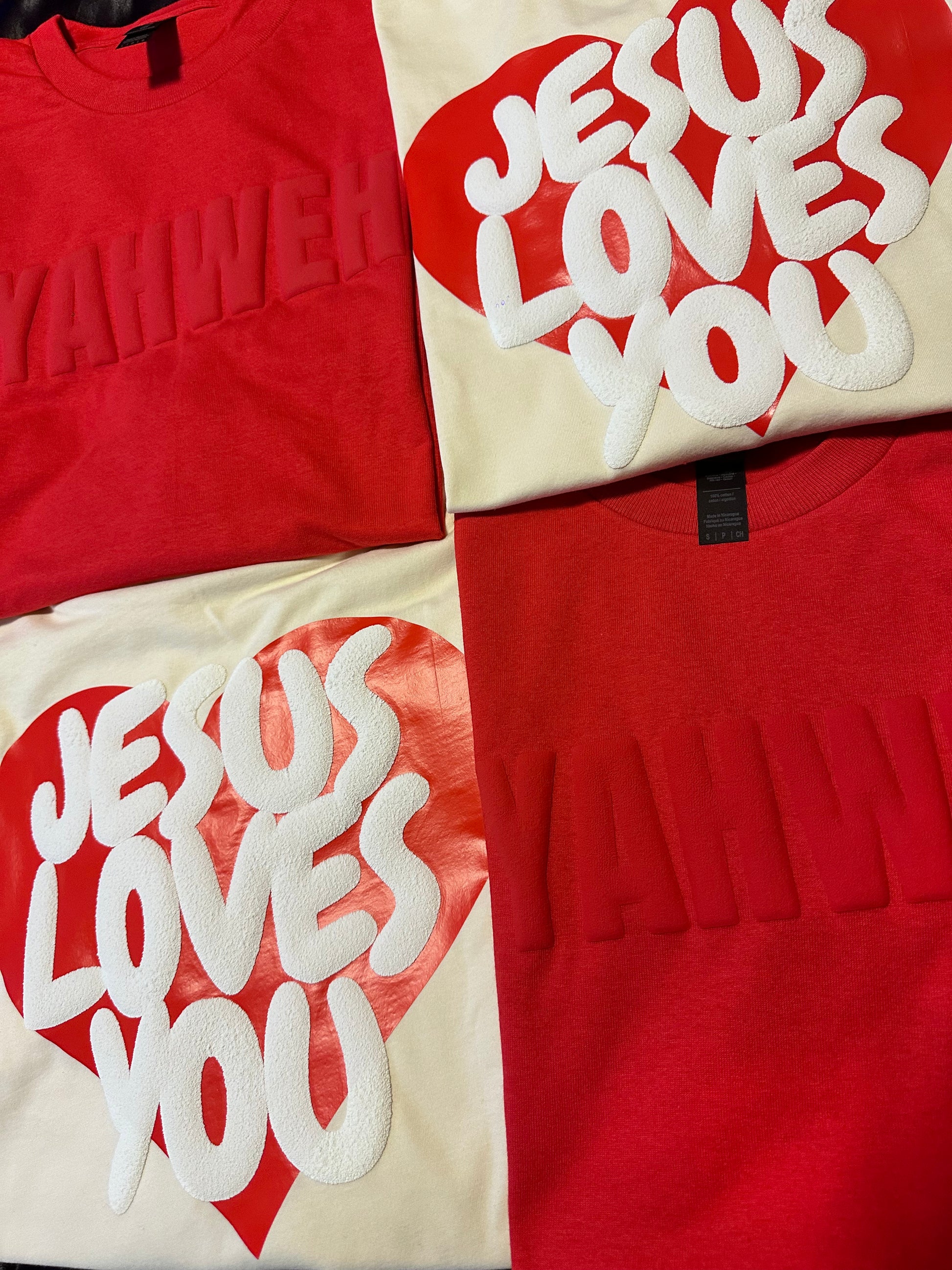 Spread love and faith with the Jesus Loves You Puff Print Tee. Featuring bold puff-printed letters on the back and a minimalist red heart on the front, this T-shirt is a perfect blend of simplicity and impactful design.