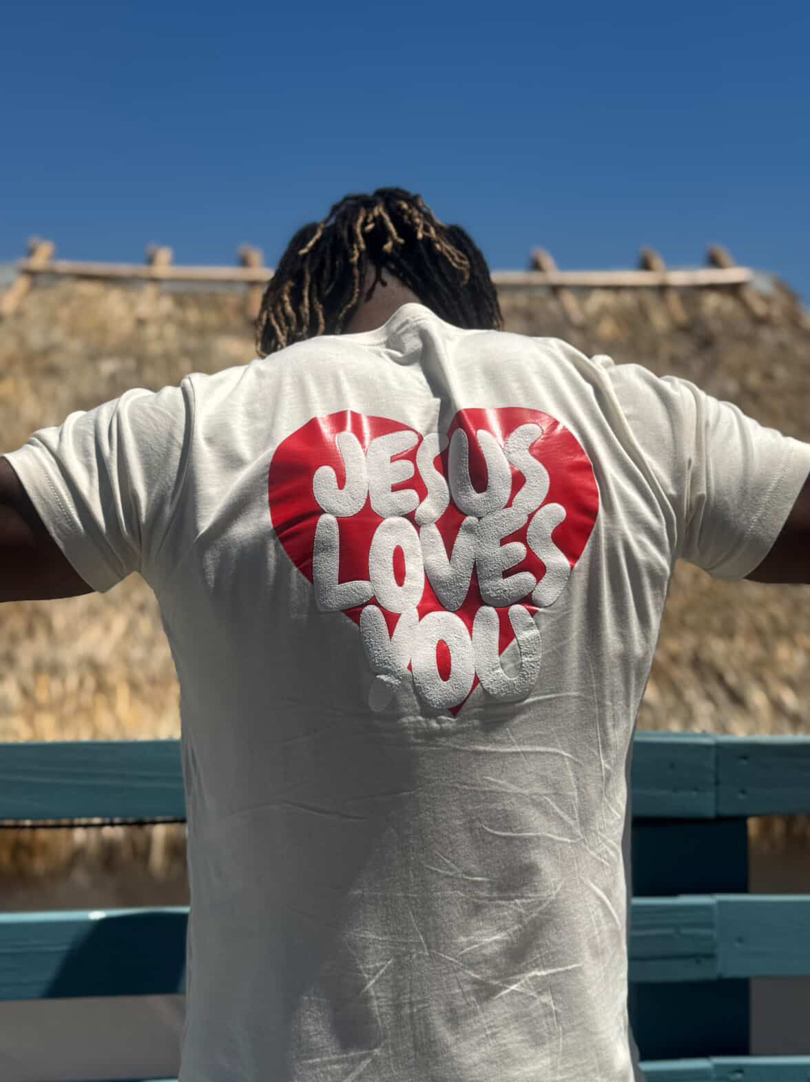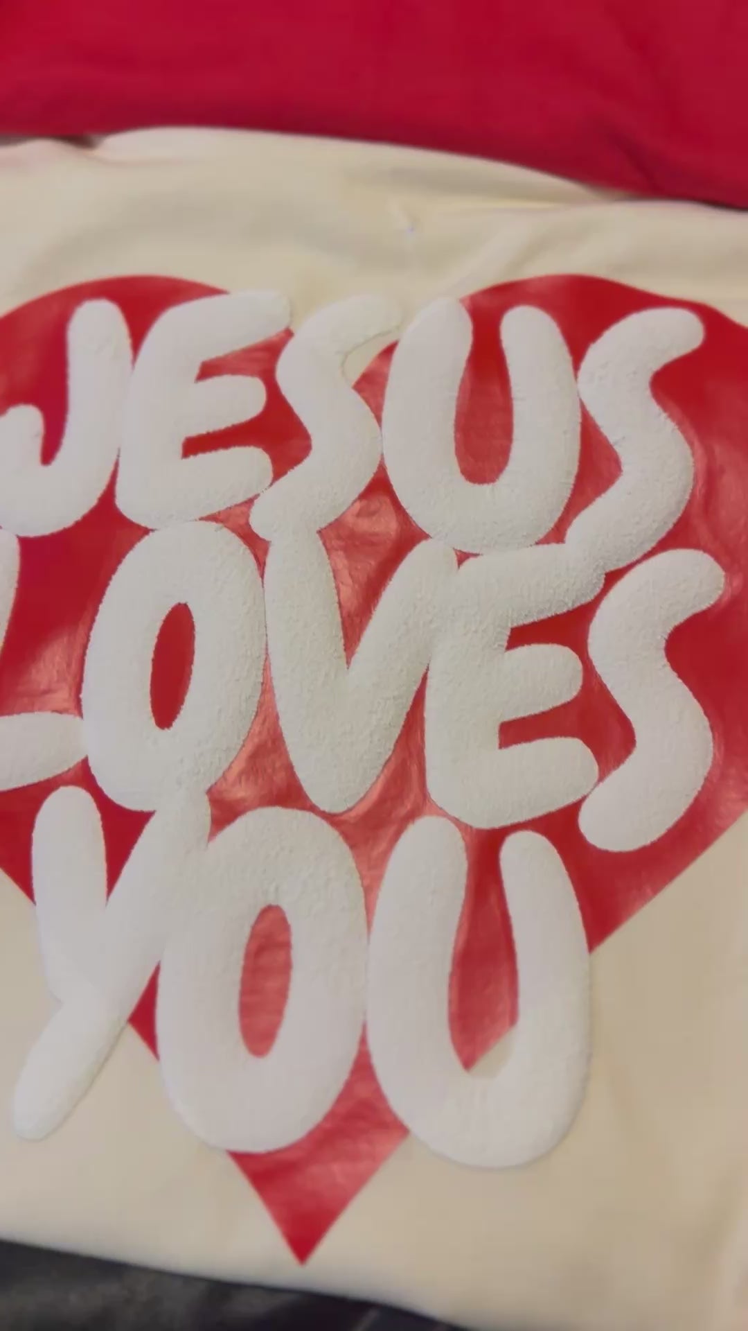 - Design: Puffy, textured "Jesus Loves You" lettering on the back with a striking red heart detail on the front.