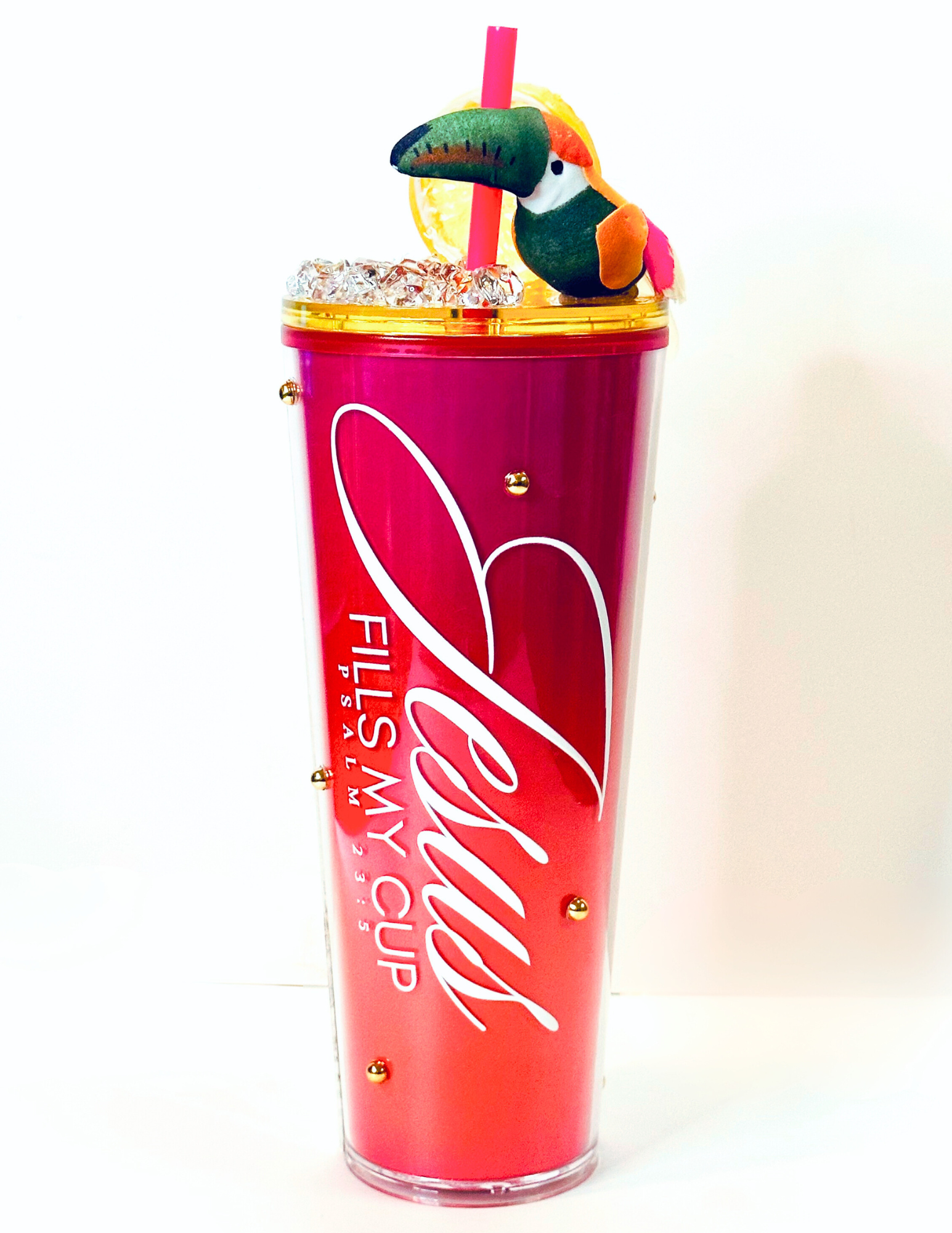 But that’s not all – perched atop the lid is a playful, colorful toucan, sipping alongside you with imitation ice and a lemon wedge. It’s not just a tumbler; it’s a whole tropical vibe! Whether you're lounging in the sun or sipping on the go, this cup is designed to bring faith, fun, and freshness to your day.