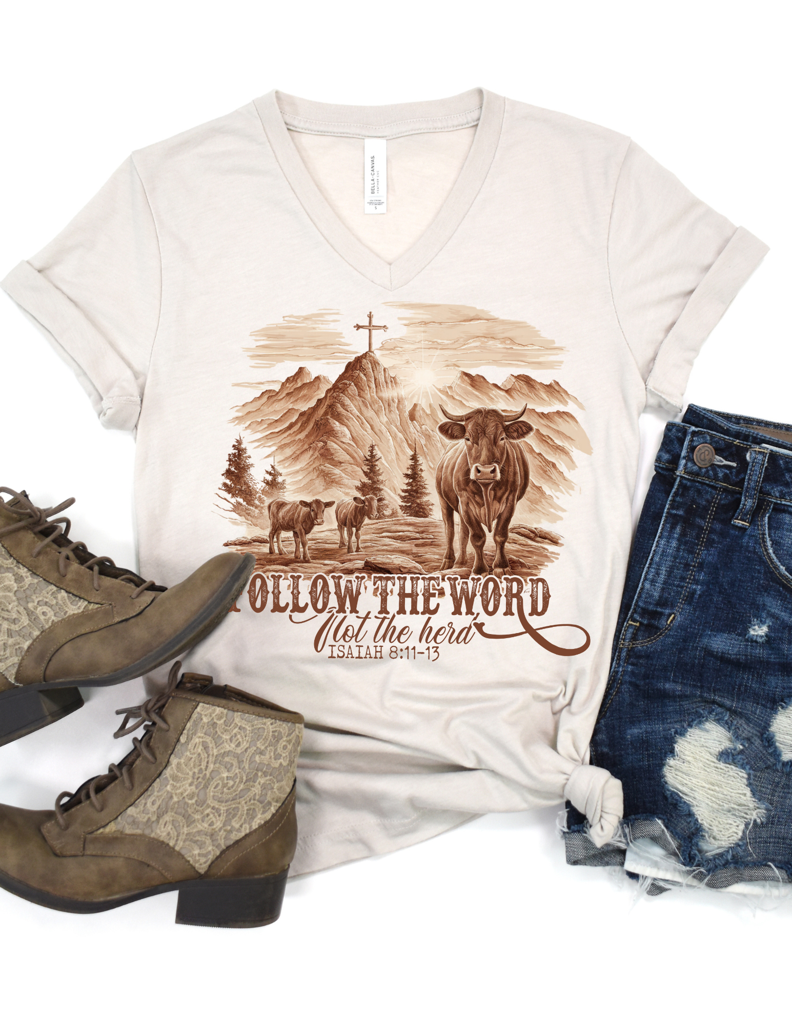 The Shepherd's Call Tee is a powerful reminder to walk in faith and stand strong in your beliefs, even when it means going against the crowd. This tee features a beautifully detailed sepia-toned illustration of a serene mountain scene, complete with a cross at the peak and a herd of cattle below. The phrase "Follow the Word, Not the Herd" alongside the scripture reference Isaiah 8:11-13, encourages you to live by God's guidance rather than conforming to the world.