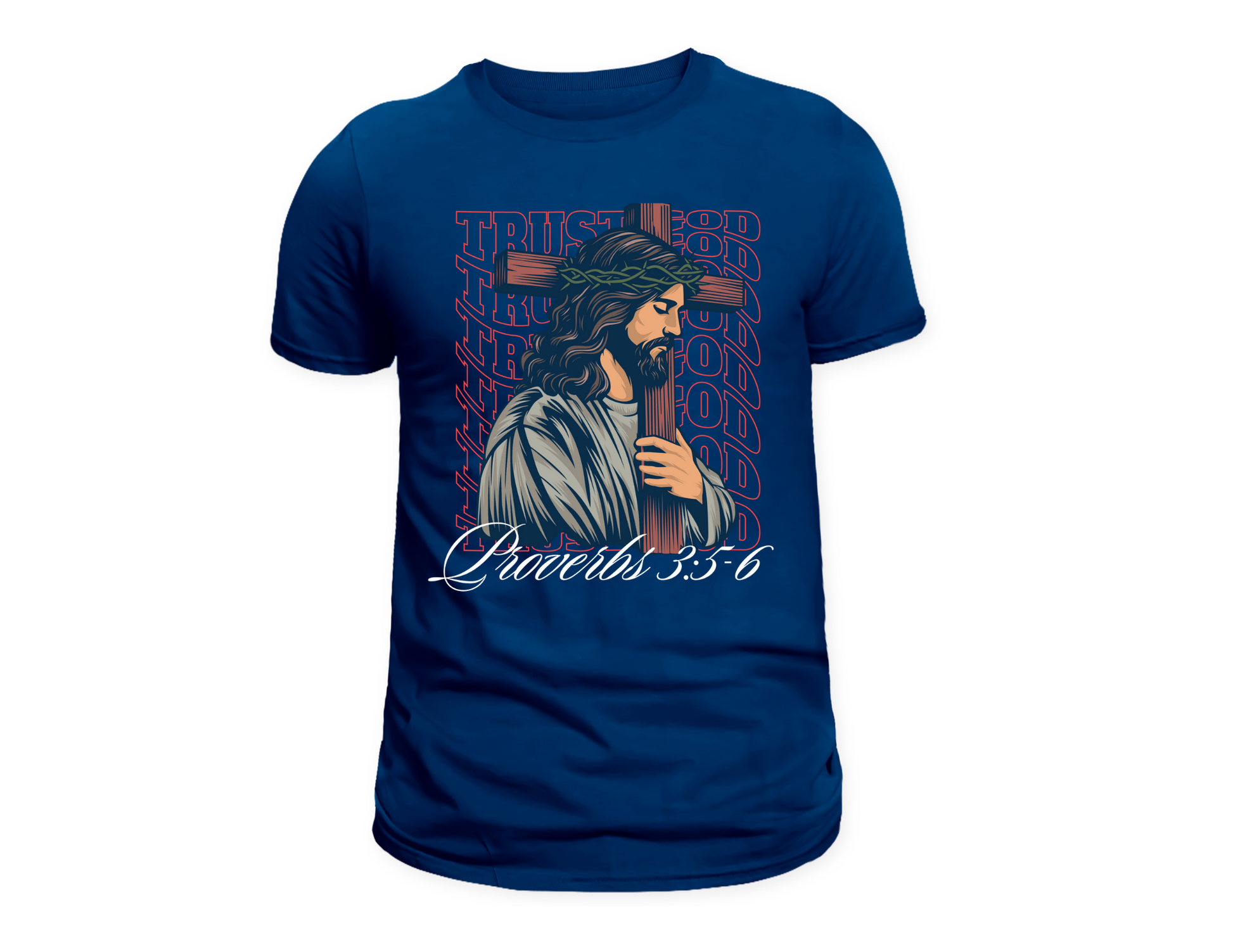 Embrace your faith with the Trust God Tee, a striking piece that combines bold design with a powerful message. This deep blue T-shirt features a detailed graphic of Jesus carrying the cross, symbolizing strength, sacrifice, and unwavering faith. The background showcases the repeated phrase "Trust God," reinforcing the importance of trust and devotion in every aspect of life.